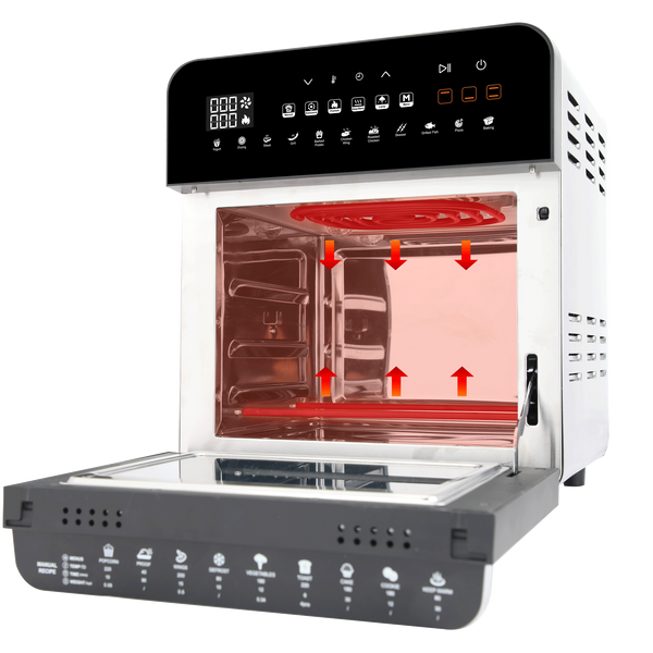 The Kuvings Air Oven is designed as an All-in-One – oven, airfryer, dehydrator, rotisserie and toaster. The large glass front panel gives you a full unobstructed view. The touch-control panel and stainless steel casing with a 14.5L capacity makes it a high-end multi-cooker with exceptional quality finishes – built to last! Enjoy healthier food with up to 80% less fat made in half the time of a conventional oven. Choose from either manual programming or automatic functions for all of your favourite foods. The Kuvings Air Oven will become an essential part of your kitchen.SpecificationsUse: DomesticType: Multi Air OvenMenu: 11 Pre-set menusPower: 1700wPower Supply: AC 220V, 50-60HzCapacity: 14,5 LColour: Phantom GreyDimensions Outer (HWD): 330 x 370 x 380 mmDimensions Inner (HWD) : 270 x 260 x 203 mmWeight: 9.5kg
