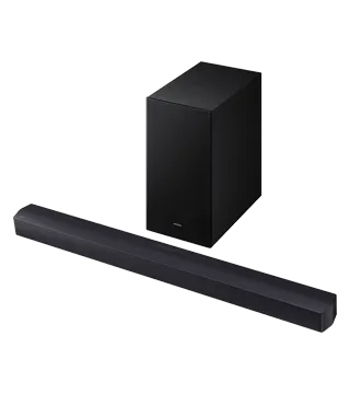 Essential C-Series Soundbar HW-C450 – Captivating audio technology that moves the sound around youDolby Audio / DTS Virtual:XDTS Virtual X creates spacious 3D sound, including the feeling of height through audio processing techniques.Subwoofer includedDeep, rich bass with a wireless subwooferThe included subwoofer connects wirelessly and delivers smooth, powerful sound from anywhere in the room.Bass BoostExtra bass, bigger sensationsFor those who want additional bass, Bass Boost mode intensifies the deep low-end to add even more thump to your viewing experience.Adaptive Sound LiteSound fine-tuned for your favorite contentAdaptive Sound Lite analyzes audio tracks to optimize sound for your specific content. So you hear clear, detailed sound – no matter what you watch.Game ModeHear better, play betterGame Mode gives you an advantage in gaming by automatically removing distracting noises and optimizing sounds to pinpoint their specific locations.Night ModePick up on dialogue without disturbing othersWatch TV at night without waking others. Night Mode compresses the bass to reduce the decibels, delivering a softer listening experience while maintaining clear sound.Voice EnhanceCatch each word and hear dialogue clearlyHear the dialogue in your favorite shows and movies with crystal clarity. Voice Enhance mode boosts vocal audio and optimizes the equalizer settings for a clear listening experience.Bluetooth® TV ConnectionConnect your Soundbar to TV wirelesslyAre cables and wires getting in the way of your setup? Simply use Bluetooth to connect your soundbar to your TV, and enjoy all your favorite content wirelessly.One Remote ControlOne remote for total controlYour Samsung TV remote isn’t just for the TV. Use it to control key Soundbar functions like power, volume and sound effects